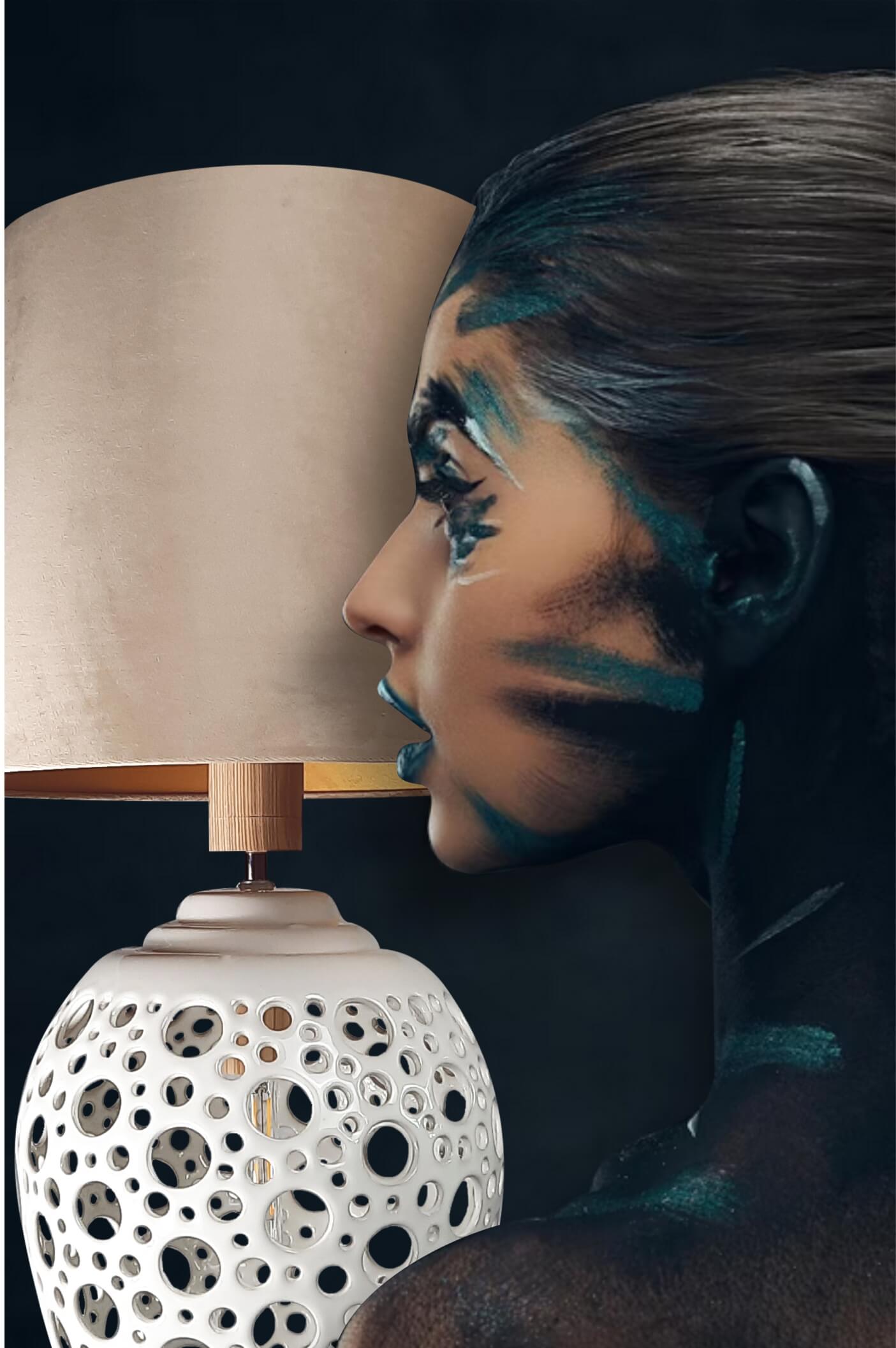 Lampa utrzymana jest w stylu lat dwudziestych. Smukła niczym antyczna rzeźba owinięta koronkowym szalem. Szczególnie duże otwory w podstawie lampy w porównaniu z innymi rzeźbami w kolekcji, pozwalają na bardziej rozproszone i bardzo oryginalne oświetlenie. Atmosfera jaką dają projekcje świetlne oraz połączenie możliwości świecenia różnych części lampy sprawiają, że stają się unikatowym dziełem sztuki użytkowej. Geometryczne wzornictwo w połączeniu z minimalistyczną oprawą i nowoczesną koncepcją nada każdemu otoczeniu niepowtarzalny wygląd.